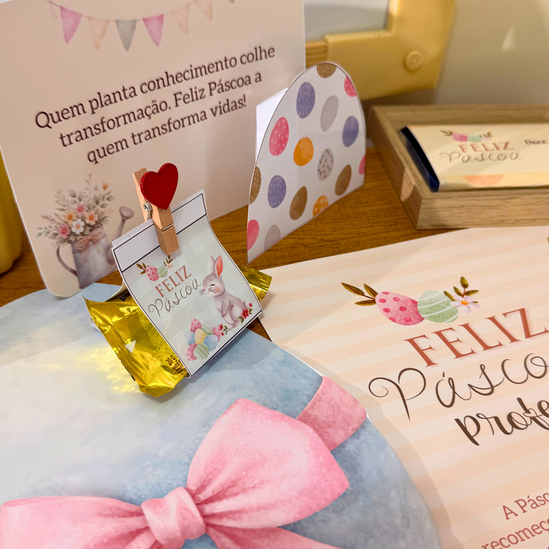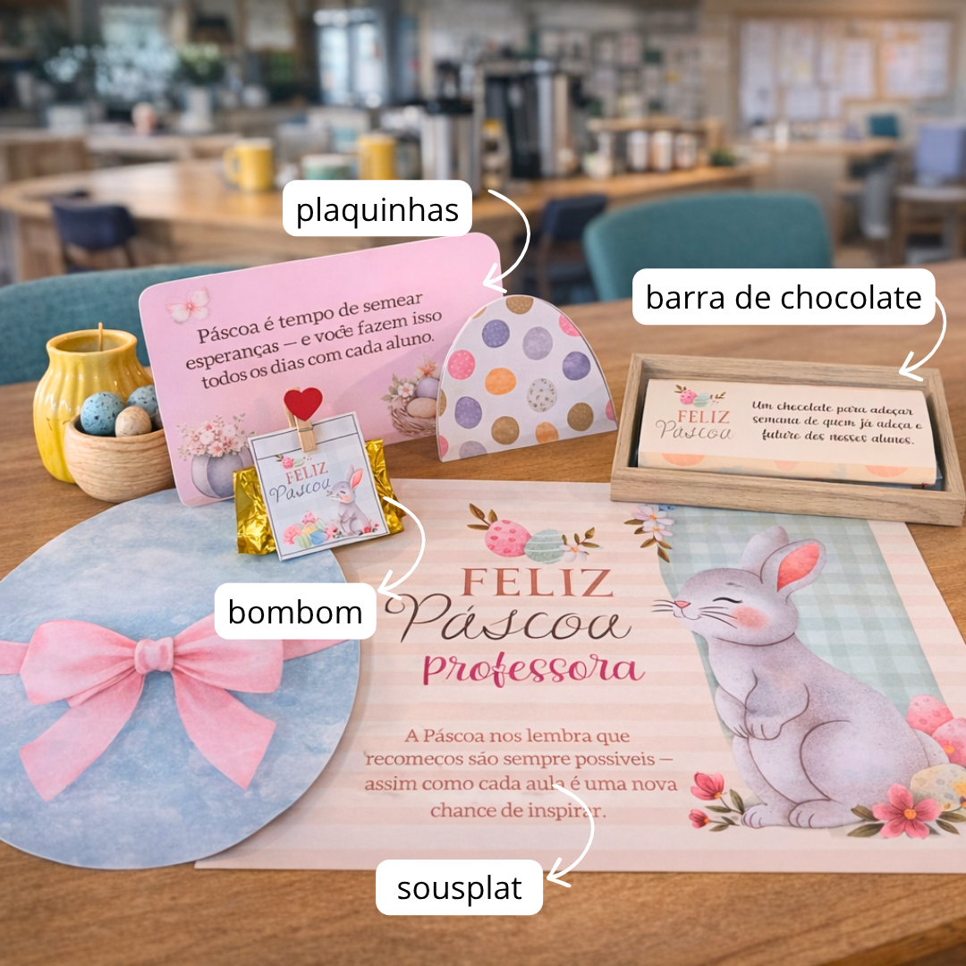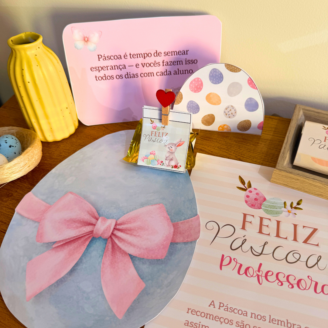 Esse momento de surpresa e acolhimento é exatamente o que o Kit Mesa de Páscoa para Professores foi criado para proporcionar — uma experiência que vai além da decoração e se transforma em reconhecimento de verdade.