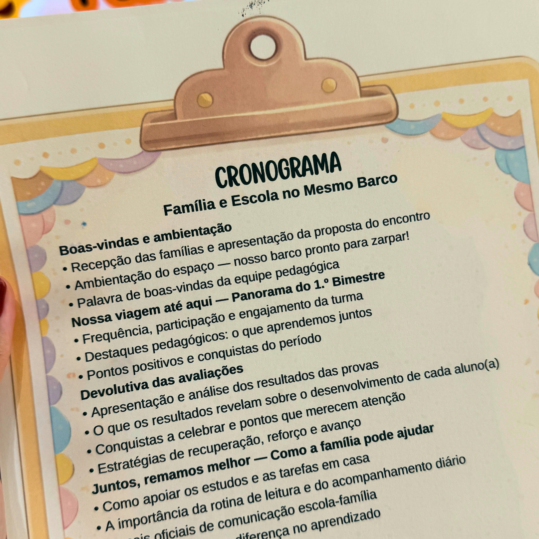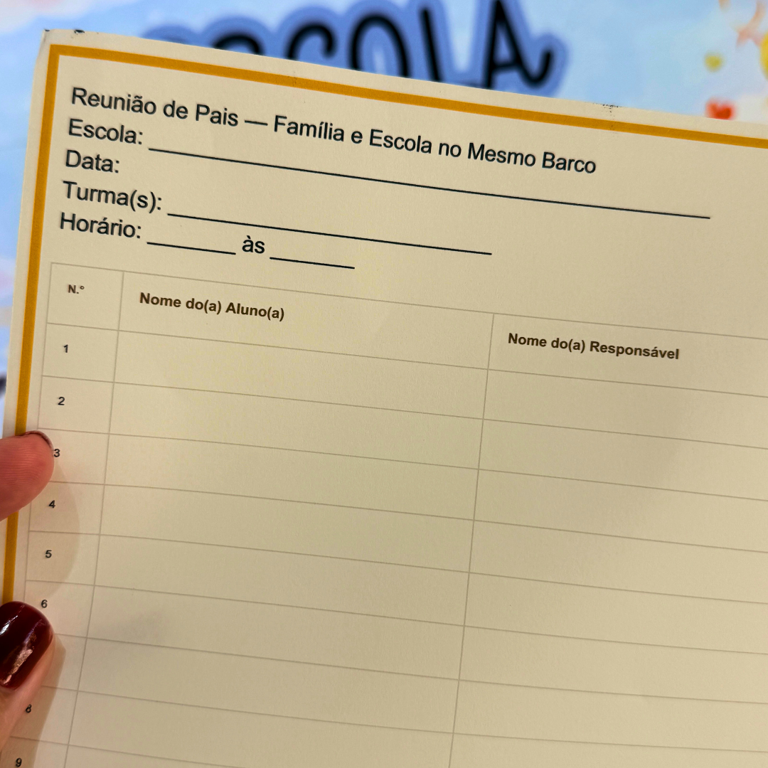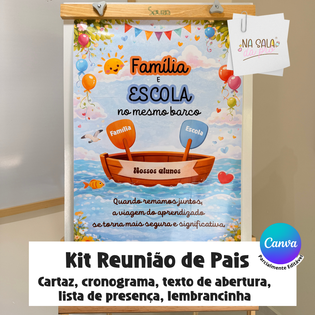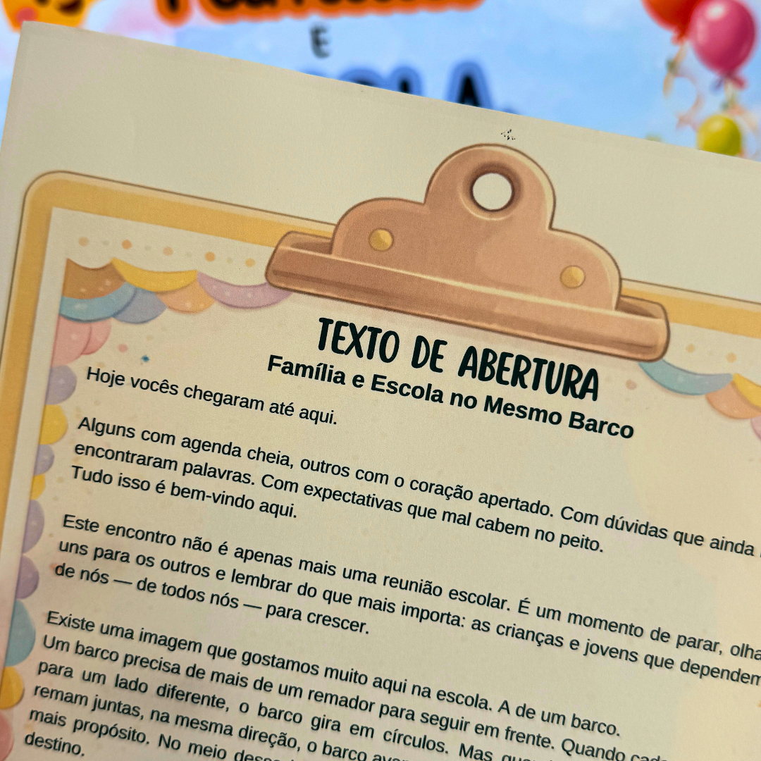 Com o tema “Família e Escola no Mesmo Barco”, este kit foi pensado para transformar a reunião em um momento de parceria real, com orientação clara, acolhimento e segurança na condução.