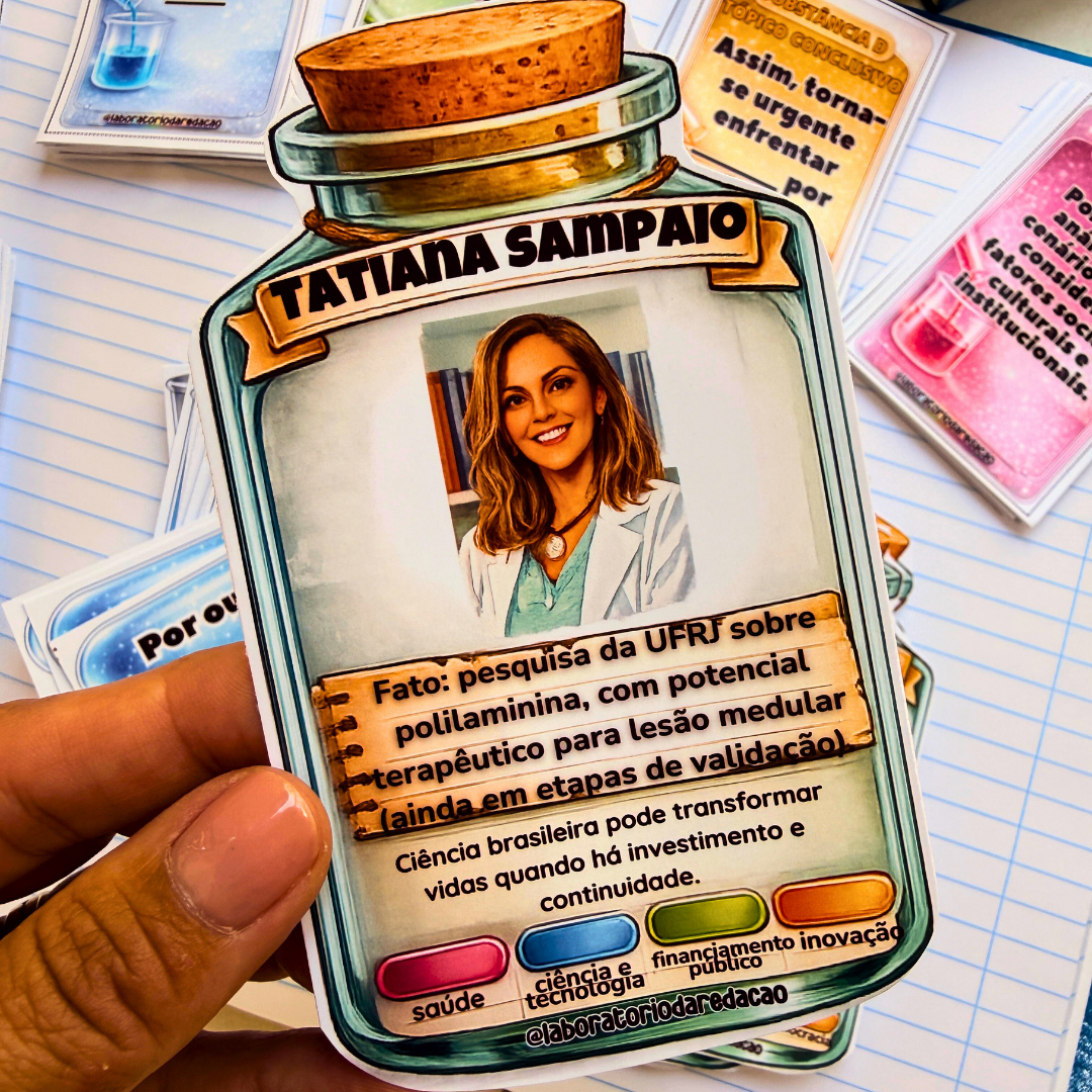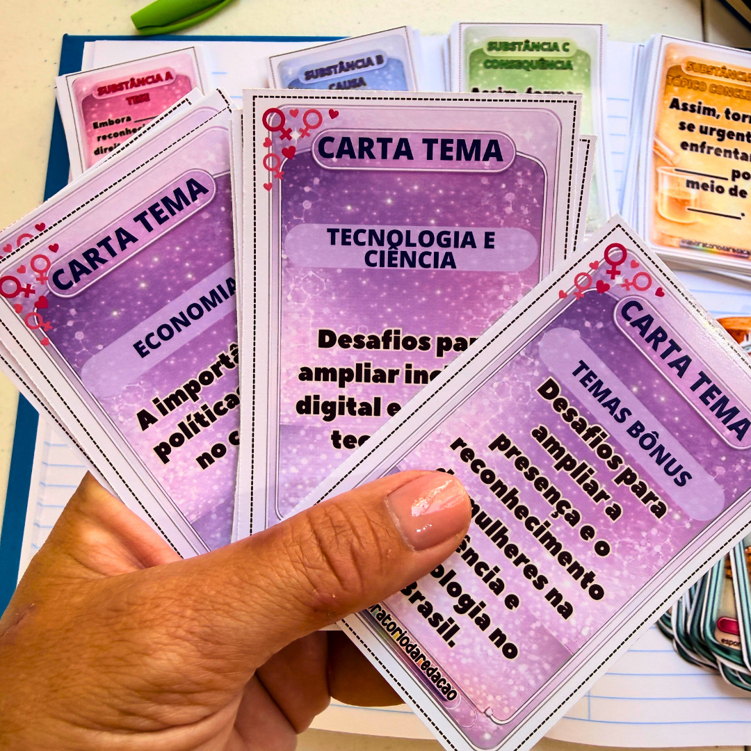 Cada rodada parte de uma personalidade feminina que funciona como base do argumento, ajudando o estudante a transformar repertório em texto com clareza, estrutura e sentido.