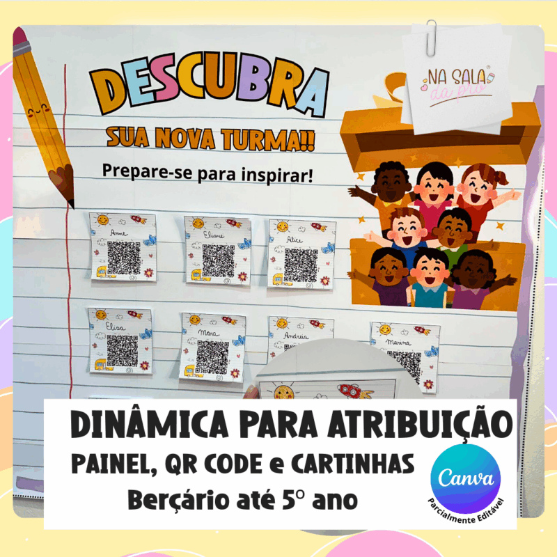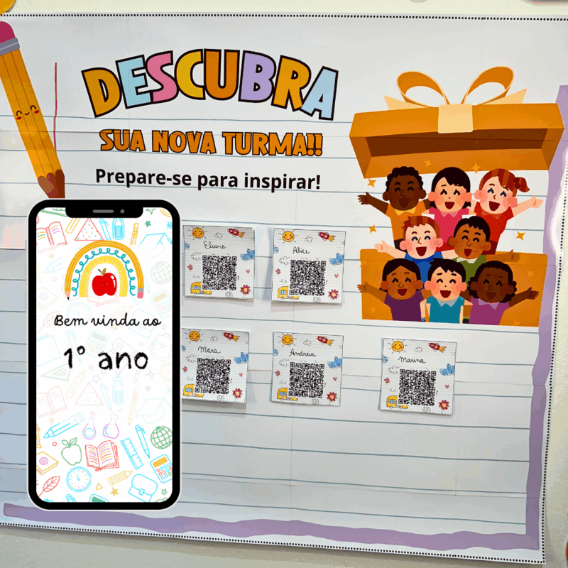 O painel para atribuição de turmas Descubra sua Turma 2026 traz cartões com QR Codes e cartinhas personalizadas para todas as etapas da Educação Infantil, Creche e Fundamental 1.