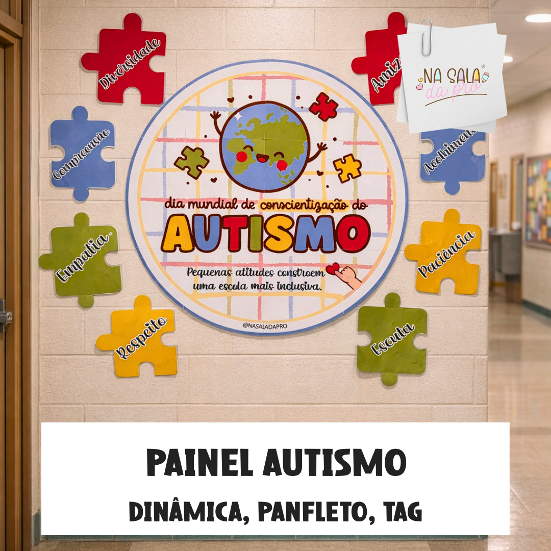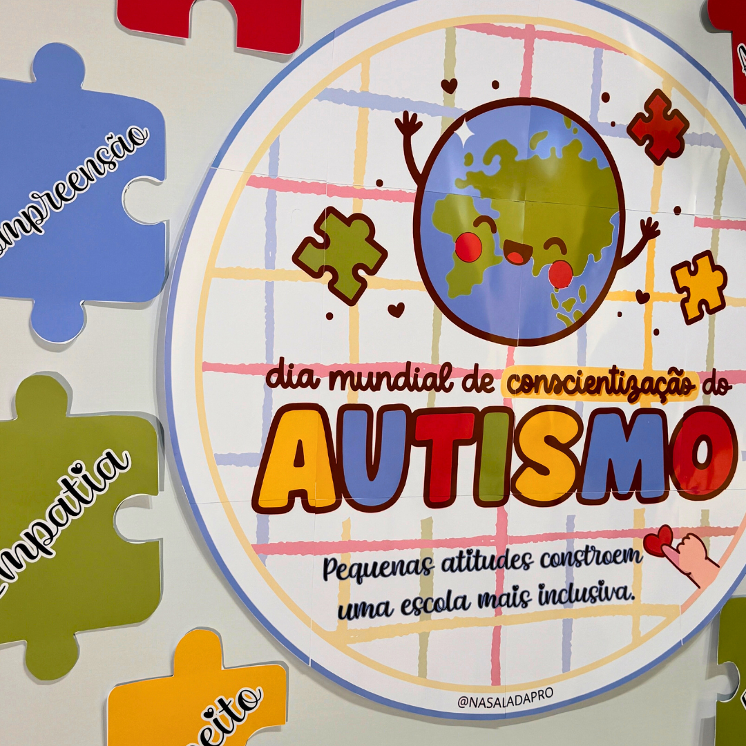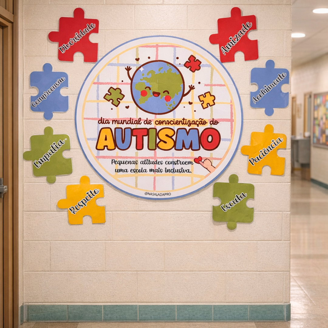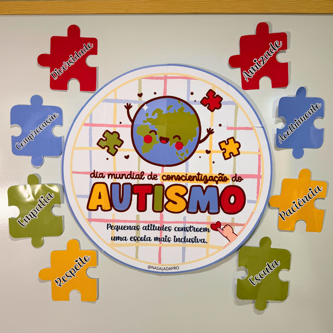 Nosso Painel Autismo foi criado para trabalhar conscientização, respeito às diferenças e inclusão no ambiente escolar de forma visual e significativa.
