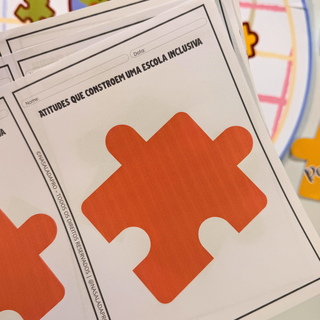 A proposta vai além da decoração: os alunos participam da construção do painel por meio de uma dinâmica com peças de quebra-cabeça, refletindo sobre atitudes que ajudam a construir uma escola mais inclusiva.